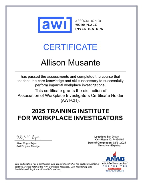 Allison Musante advises employers on a wide range of labor and employment issues, and she helps companies formulate policies and practices to be in compliance with California’s complex, ever-changing employment laws. Ms. Musante also represents employers in all types of employment litigation, including the defense of discrimination and harassment claims, PAGA lawsuits and wage-and-hour class actions. Additionally, Ms. Musante conducts independent, neutral workplace investigations. She is an Association of Workplace Investigators Certificate Holder (AWI-CH).